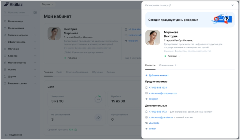 HRM система Skillaz получила сразу несколько важных обновлений, которые затрагивают профиль сотрудника, работу с обучением, оргструктуру и инфраструктуру платформы. В профиле сотрудника появился полноценный виджет образования с формой редактирования. Теперь опыт обучения (основное и дополнительное образование, тесты, сертификаты) можно заполнять и обновлять без участия администраторов. Вкладки профиля теперь можно локализовать — а значит, переименовывать и адаптировать под внутреннюю терминологию компании. Баннер поздравления с днём рождения в драйвере сотрудника стал проще и стабильнее. Сейчас он поздравляет именинника и сообщает коллегам о событии. Параллельно в пользовательской части стала доступна смена языка, если в системе настроена локализация. Появился экспорт должностей по API для интеграции с внешними системами. В платформе появилась новая сущность — штатная позиция, а также API для работы с ней.