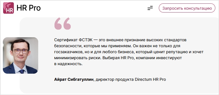 Эксперты Федеральной службы по техническому и экспортному контролю подтвердили соответствие платформы, на которой работает система Directum HR Pro, всем требованиям информационной безопасности. Сертификат выдан по 4-му уровню доверия. Это значит, что решение можно внедрять в государственном секторе и на объектах критической инфраструктуры. Для коммерческих компаний документ от ФСТЭК служит независимым гарантом надежности системы при обработке персональных данных. Прохождение сертификации — комплексный и длительный процесс экспертной проверки. Его успешное завершение демонстрирует безопасность самой платформы и зрелость компании-разработчика в вопросах защиты информации.