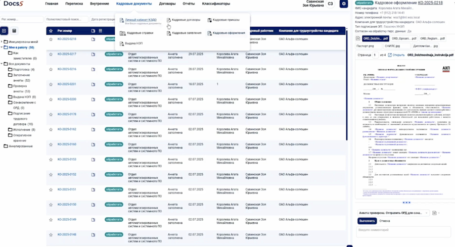 Система позволяет вести кадровый документооборот в электронном виде, обеспечивая при этом юридическую значимость документов на протяжении всего их жизненного цикла. Работодатель и работники подписывают документы электронными подписями, в том числе, выпущенными в приложении «Госключ». Интеграция с 1С:ЗУП делает работу кадровиков удобной, а сотрудники оформляют документы «на ходу» в своем смартфоне. Система поддерживает работу с кадровыми договорами, соглашениями, заявлениями, приказами, справками.